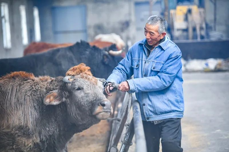 2月14日,位于烏魯木齊高新區(新市區)安寧渠鎮的塞外水鄉生態(tài)農場(chǎng)員工在棚圈照看肉牛