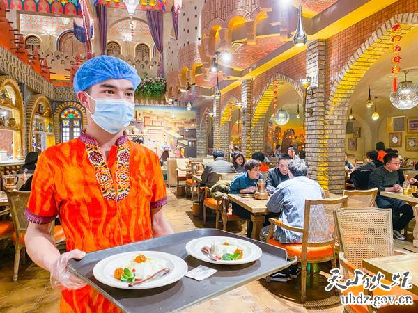 近日,在丑馬一號文創(chuàng )園內的樓蘭秘烤餐廳,服務(wù)員將烤肉、包爾薩克、酸奶粽子等新疆特色美食接連端上餐桌,演藝團隊穿上民族服飾跳起麥西熱甫,在晚餐期間為食客們帶來(lái)視覺(jué)和味蕾的雙重享受,不少食客都是慕名而來(lái)。